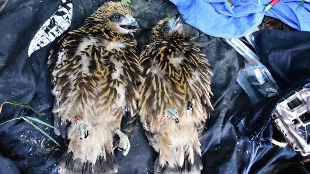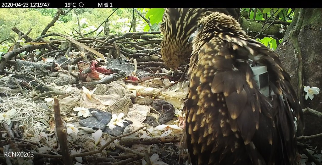2020年春天,我們循著曾經踩踏過的路徑前往一處黑鳶巢,那裡在2017年繫放過另一隻幼鳥「大寶寶」。溪谷的空氣悶熱而黏膩,沿路上堆積著油桐與酸藤落花。抵達巢位時能看見親鳥正從附近枯枝上的停棲位置觀察我們。巢內沒有什麼浮誇的垃圾,主要是手套、各種布製品、濕紙巾和一尾肚破腸流的鯉魚。兩隻約30日齡的幼鳥本能地趴低身體,試圖利用斑駁的羽色融入背景隱藏自己。我們將幼鳥吊掛至地面由一組人盡快完成繫放過程,並讓體重較重的紅M9小米酒負責背負追蹤器的任務。