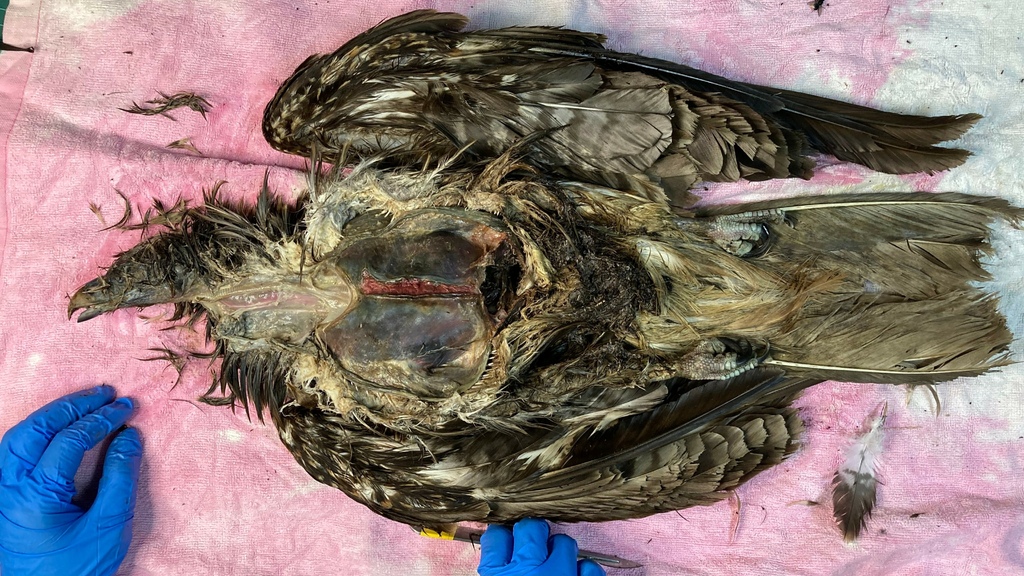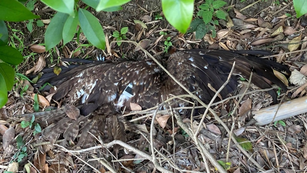 2021年4月7日下午一點,小米酒的位置訊號出現在先前從未來過的桃園平鎮區,那是一處夾在聚落之間,由農耕地、草生地與雜木林鑲嵌的棲地,以黑鳶來說是一點都不奇怪的活動區域,但接下來四天訊號似乎都只有<15公尺的移動,但無法確定是個體小範圍移動、或者是死亡後衛星定位的漂移。在4月12日我們追隨著最後的GPS定位訊號,將車輛駛進田間的道路,很幸運地在炙熱的陽光下找到一處遮陰停泊。經過兩個多小時的搜尋後在一處灌叢間找到趴臥的小米酒,雙翅往兩側展開,成群蛆蟲在眼睛、口部和腹部等柔軟的組織上,正努力執行牠們的生態角色—清除死亡的動物。經過猛禽會救傷站獸醫師的解剖檢查,並未發現明顯的體內外創傷,毒物檢驗則驗出農藥和數種毒鼠藥,所以小米酒又是一起毒物危害的受害者,然而究竟是愛冒險的他在陌生的土地吃下毒藥,或者因為累積的毒素讓他昏昏沉沉的飛行並墜落在這塊農地上,我們永遠也得不到答案。