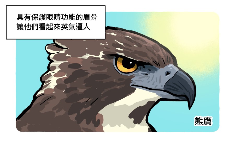 部分猛禽的眼窩上緣的頭骨突緣明顯(大家俗稱眉骨的位置,可稱眉突)能在衝撞時保護眼球,也有遮擋強光、減少炫光干擾的功能。