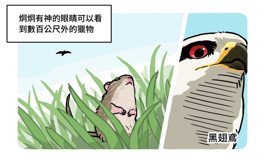 深邃的雙眼猛禽炯炯有神的大眼像似要看穿人心。較大的眼球能讓視網膜上的投影影像更大;而其視網膜上感光細胞密度極高,因此視覺敏銳度可達人類兩倍以上。此外,多數猛禽有2個中央窩:淺中央窩負責近物、深中央窩增加眼球的長度和放大影像,提高遠處的解析度,雙中央窩這樣的特殊構造可讓猛禽兼顧遠近兩種。