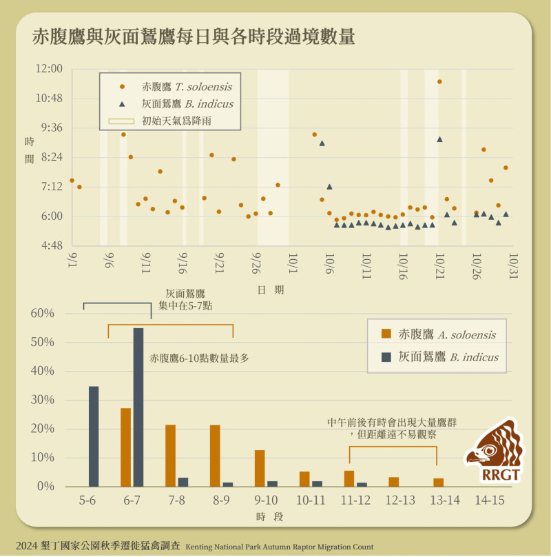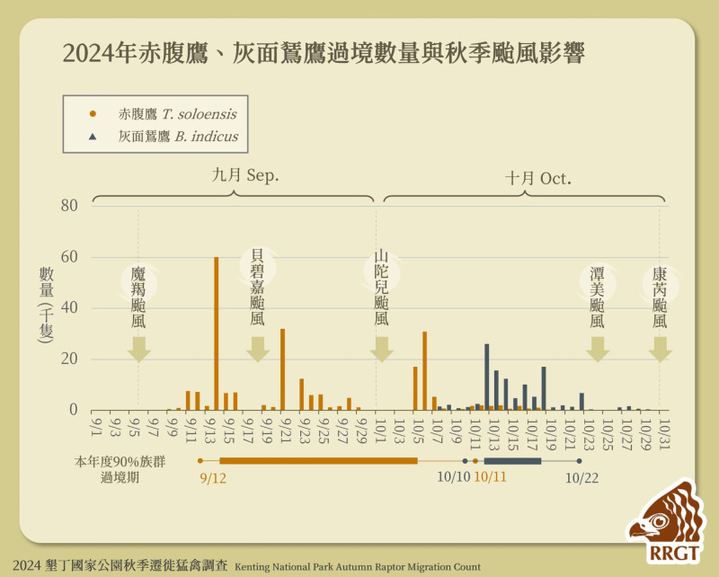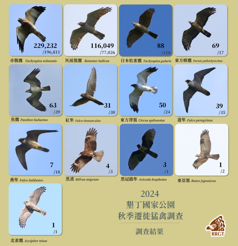 本調查自9月1日持續至10月31日,由兩名調查員持雙筒望遠鏡掃視空域,並記錄下遷徙猛禽的物種與數量。2024年調查執行56天,記錄遷徙性猛禽13種,345,637隻,以及留鳥猛禽5種。詳細遷徙猛禽物種與數量詳見附圖,照片右下角的兩個數字分別代表今年的調查結果,以及該物種近10年的調查平均數量。今年不時下起小雨稍顯涼爽的9月,和東北季風缺席而豔陽依然高掛的10月天氣有點不尋常,赤腹鷹與灰面鵟鷹過境數量再次出現小高峰,分別位居歷年數量的第四與第二,而有些物種則似乎異常的稀少或稍微遲到了。