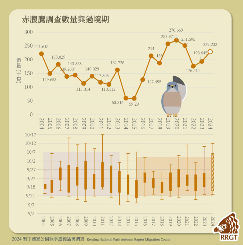 2024年秋季我們記錄了229,232隻赤腹鷹(近10年平均196,811隻),主要過境期9月12日至10月11日。比較本調查2004〜2013以及2015〜2024前後兩階段的平均數量與過境時程,赤腹鷹數量與過境期波動幅度較大,調查初期數量呈現減少的趨勢, 2014、2015調查數量曾低至6萬隻。近年數量增加,平均數量較初期10年增加了24.7%。主要集中在九月中下旬的赤腹鷹過境期適逢颱風好發季節,當遷徙路徑受到壞天氣阻礙時,過境期便可能延後到十月中下旬,因此年度之間過境時程與長度。均有所差異但並未顯示特定的變化趨勢。