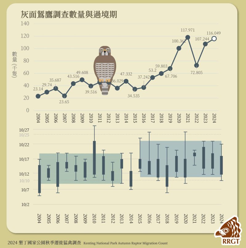 2024年秋季記錄灰面鵟鷹116,049隻(近10年平均77,026隻),僅次於2021年的117,971隻,主要過境期10月10日至10月22日。比較本調查2004〜2013以及2015〜2024前後兩階段的平均過境時程,前者為10月9日至10月19日,後者則為10月11日至10月22日,灰面鵟鷹過境臺灣的時程略有延遲的現象。