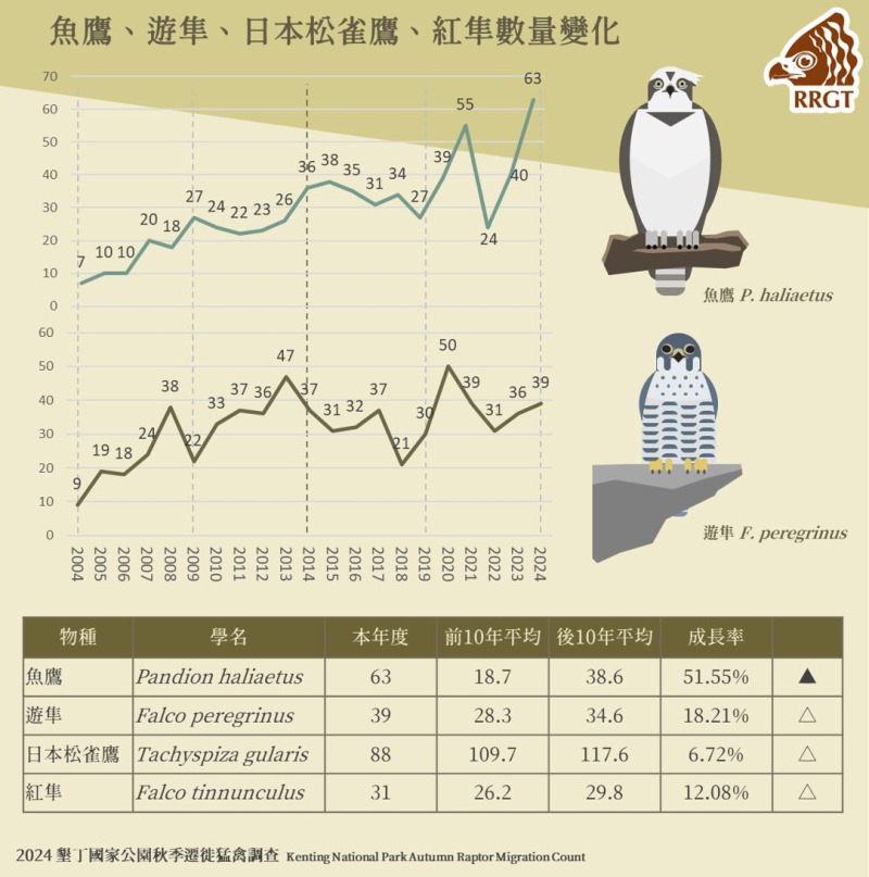 魚鷹的數量呈現增加趨勢,遊隼也有小幅增長的趨勢。魚鷹和遊隼廣泛分布於五大洲以及鄰近大陸的島嶼,20世紀初期及晚期,幾種猛禽族群接連遭受大規模的獵殺和DDT等環境用藥的毒物累積危害,造成許多地區族群幾近滅絕或局部滅絕。所幸禁用DDT以及制定野生動物保護法律、架設巢臺與族群再引入等保育措施施行之後,過去3、40年間北美、歐洲等地的魚鷹、遊隼族群均有顯著的成長。日本1970年代至2010年代全國鳥類繁殖分布調查結果顯示魚鷹在日本的分布區域明顯增加。因此我們認為本調查觀察到的成長趨勢與東亞地區族群也正在逐漸恢復有關。早在30多年前已全面禁用的農藥DDT至今仍能從死亡的黑鳶體內驗出其代謝產物DDE,可見這場猛禽的噩夢雖然看似遙遠,但其實際影響比我們能夠想像的都還要長久。