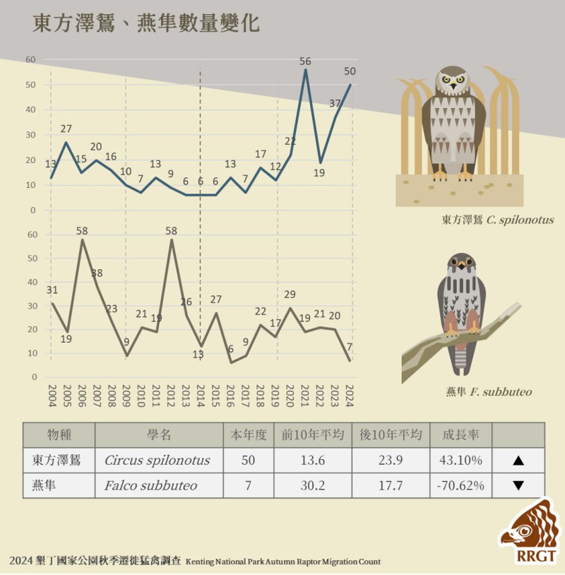 東方澤鵟和燕隼近10年平均數量較調查初期10年分別大幅的增加與減少。由於這兩個物種屬於不普遍過境猛禽,數量較少而年間波動幅度比較大,整體數量並未顯示增加或減少的趨勢,但東方澤鵟於近四年的調查結果確實有高於過往的現象。過境數量的變化除了族群本身數量波動外,其遷徙生態如對度冬地與遷徙路徑的忠誠度、是否有爆發性遷徙的現象(意旨因為獵物豐富度、溫度等外部因素而改變遷徙的時程與距離),以及颱風影響對該遷徙族群的衝擊等,也會造成年度間的大幅波動。目前東亞地區對這兩種猛禽的研究均非常缺乏,而鵟屬和澤鵟屬猛禽是否在台灣變得更普遍,或是有爆發性遷徙現象,也是相當值得玩味並持續收集案例的課題。