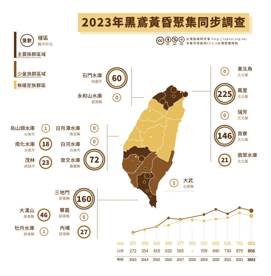 2023年的黑鳶黃昏聚集同步數量調查,秋季數量為683隻、冬季數量為808隻,近年黑鳶族群數量穩定維持。我們將9月調查到的數值用以估計監測台灣黑鳶的留鳥族群數量,此時,在台灣繁殖的黑鳶、未參與繁殖的個體、當年度出生的黑鳶幼鳥均已經加入公共夜棲地的夜棲。冬季12月時由於已有黑鳶候鳥族群抵達加入台灣度冬,因此我們將12月調查到的數值808隻用以估計監測台灣黑鳶的留鳥族群加上候鳥族群。